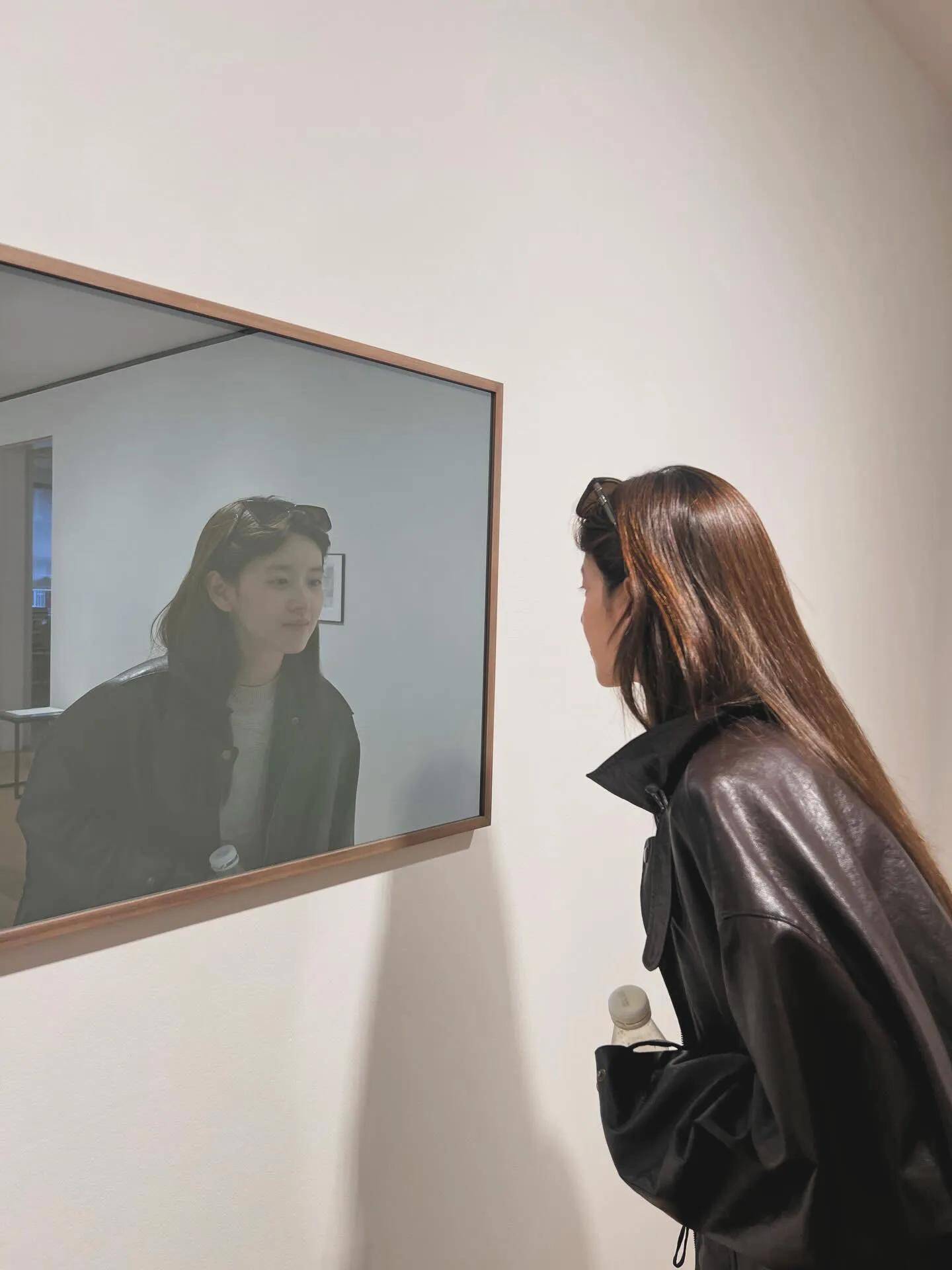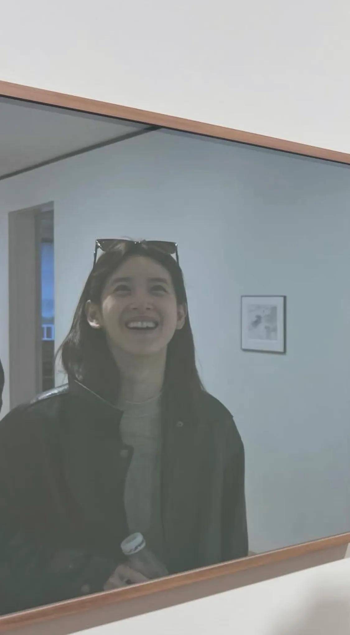 章泽天在画展上照镜子,镜中的她略显憔悴。