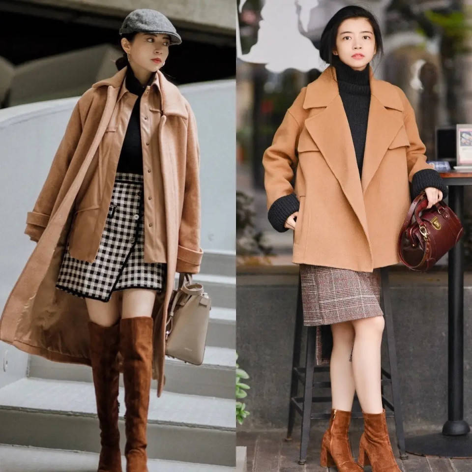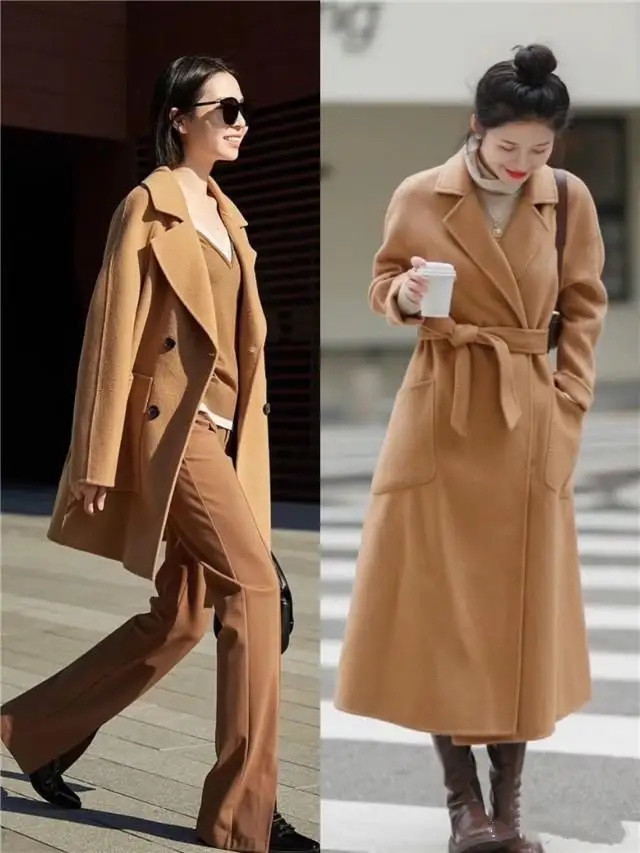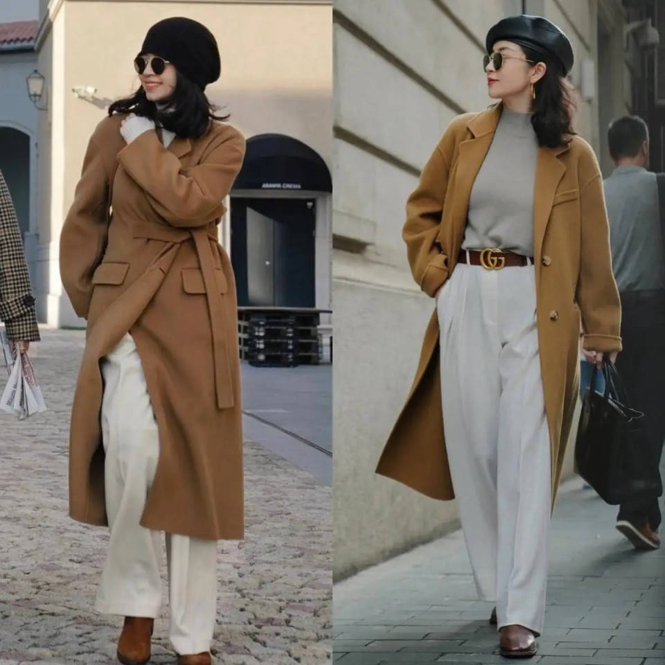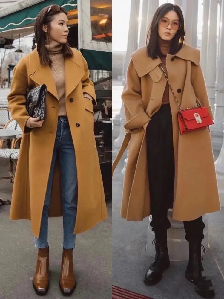 就算是高个子女性选择美拉德色系的大衣外套,也是需要有高腰收腰的设计,而且大衣外套的长度还不能过长,盖过膝盖超过三至五厘米最佳。