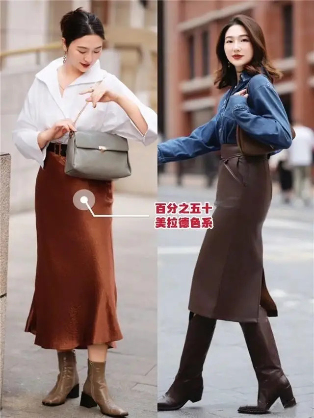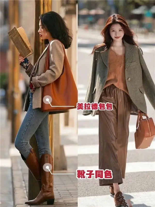我们不光要在衣服上色彩有美拉德色系,我们也可以在配饰上小功夫,例如下面美拉德色系的腋下包,或者是同色系的皮质中筒靴,也可以是手提包,再搭配上一些比较浅色系的衣服,也能点亮整个造型的色彩,变得高级。