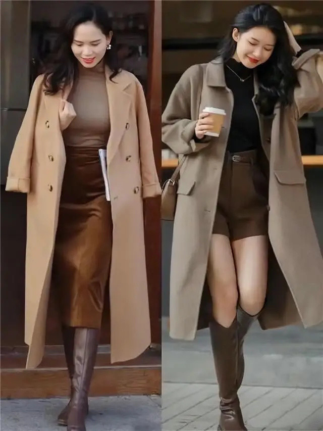我们也可以选择浅驼色的高腰小腰款大衣外套,内搭高领的燕麦色针织打底衫,脚上穿了一双棕色的中筒靴,里面可以搭配一条半身裙,不过裙子长度不要超过大衣外套,因为这个时候你需要把大衣外套的腰带系起来,就能很好的提升你的腰线了。