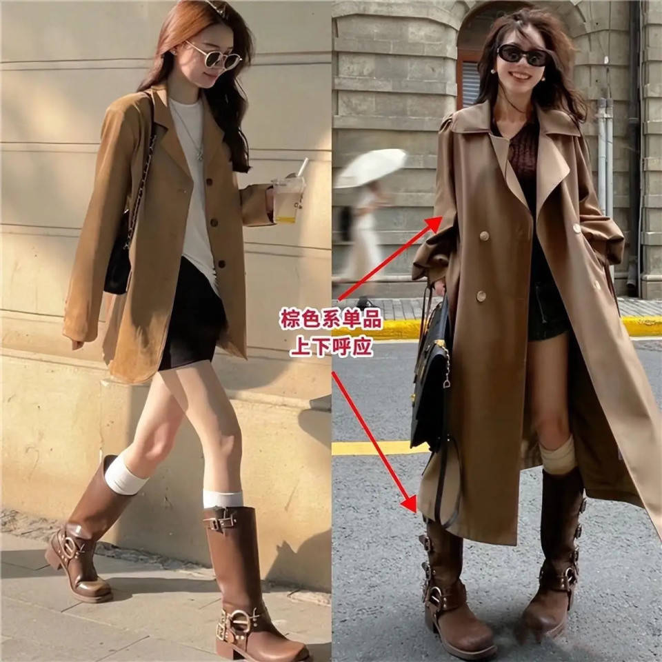 也可以让整体的配色形成一个首尾呼应的效果,例如,下面棕色系的风衣外套搭配上一款棕色系的中筒靴,这样的配色就能让整个造型的色彩非常的协调。