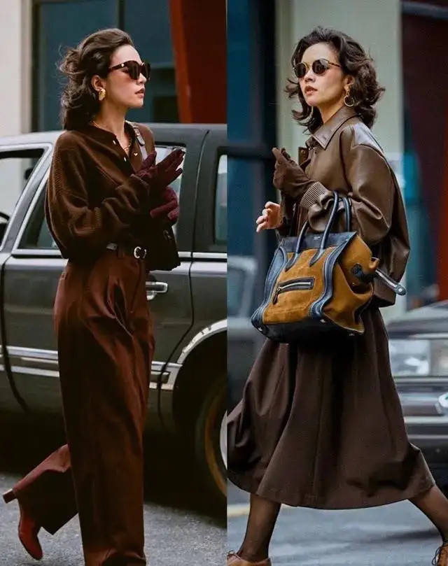 我觉得下面这位时尚达人的美拉德色系穿起来很酷,不管是用衬衫搭配上西装裤还是皮衣外套搭配上半身裙,都能散发出一种很酷的气质,又飒又高级。