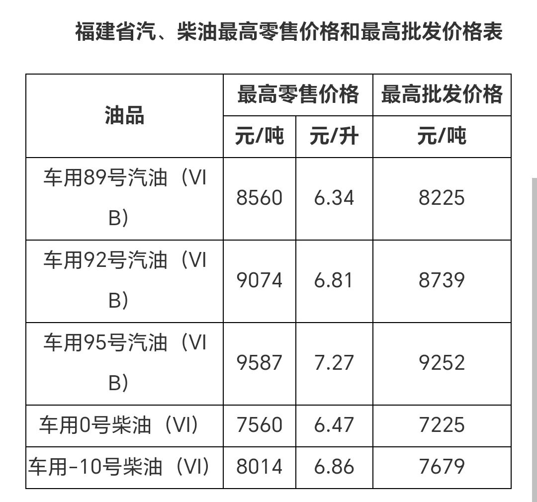 调整后,福建92号汽油为6.81元/升,95号汽油为7.27元/升,0号柴油为6.47元/升。